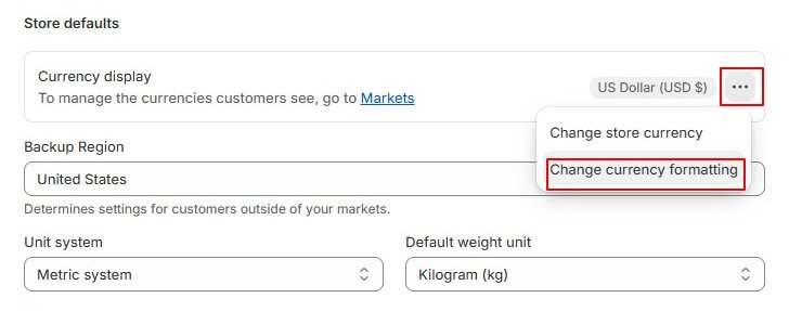 From your store Admin -> Click Settings -> Locate General -> Store defaults