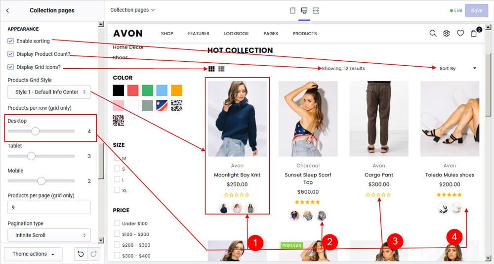 Grid icons, a product count, and a filter dropdown that is displayed above all products on the collection page