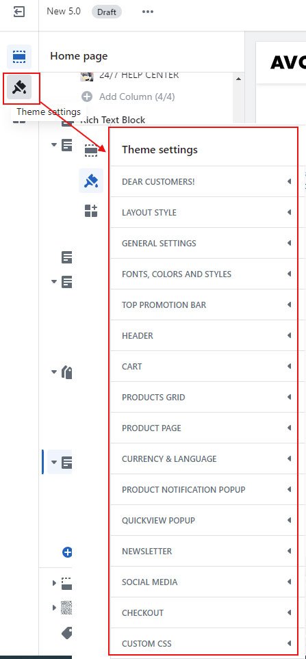 In the theme editor(Customize) –> Click "Theme settings" –> Locate "General Settings" In the theme editor(Customize) –> Click "Theme settings" –> Locate "Fonts, Colors and Styles"
