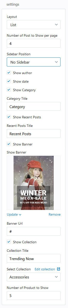 Go to Store Admin >> Online Store >> Customize >> Sections >> Blog Posts