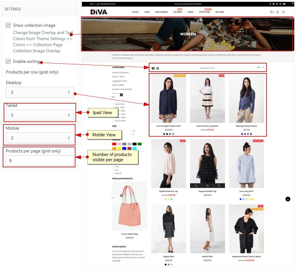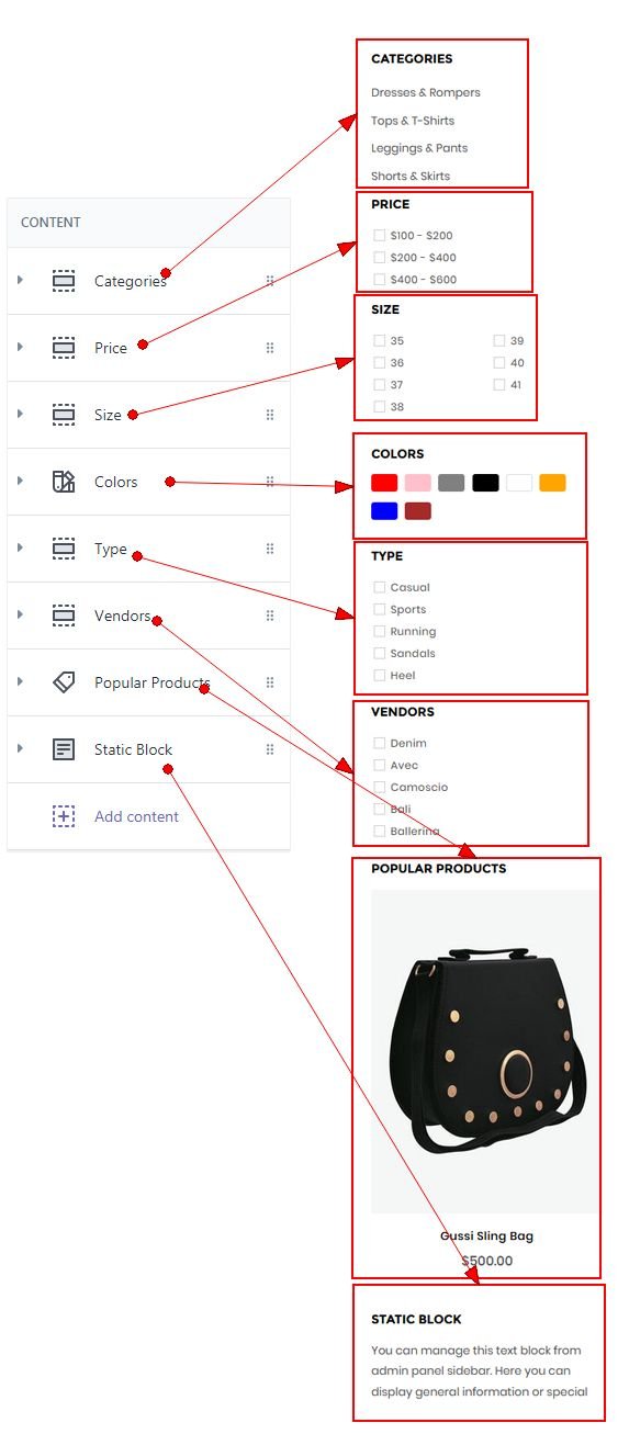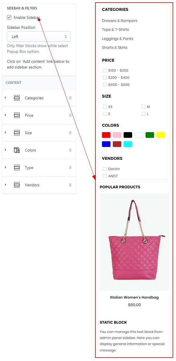 You can add unlimited filters, Populer products (Either you can use list or slider), Static text block and Promotion banner. Product filters worked on product tags. So carefully enter product tags at both side. ( Explained in detail at Use of Variants and Filtering section