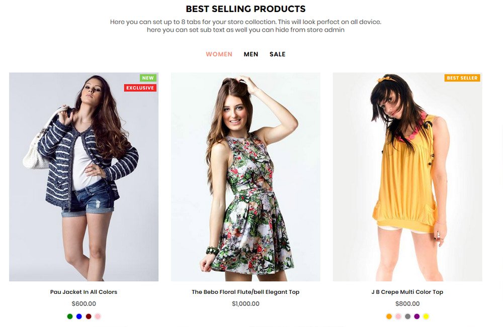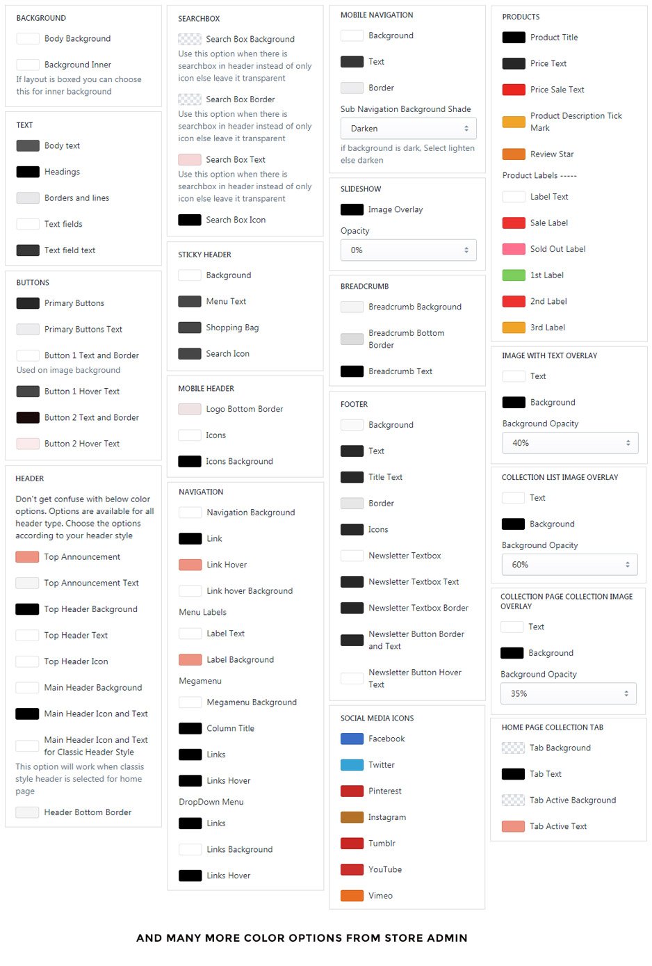 You have lots of options to config the Color of whole theme, Header, Footer, Page, Page Title, Section Title, Buttons, Price, Products tabs and many more...