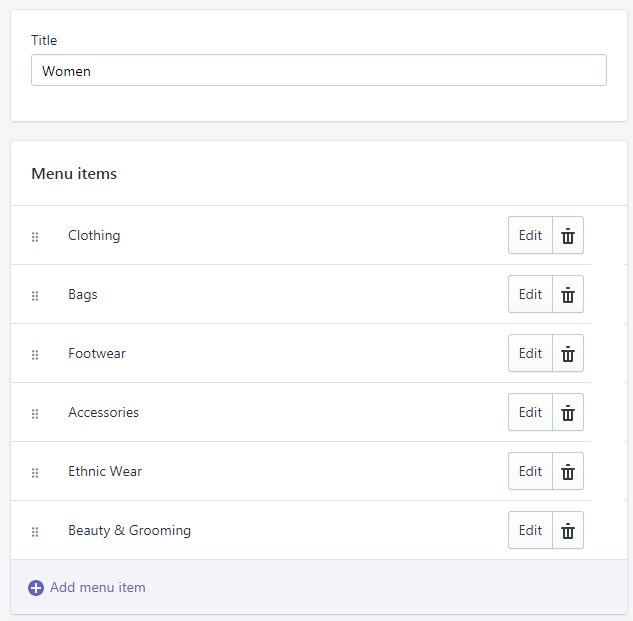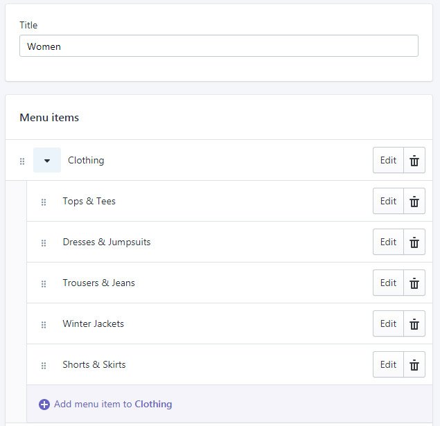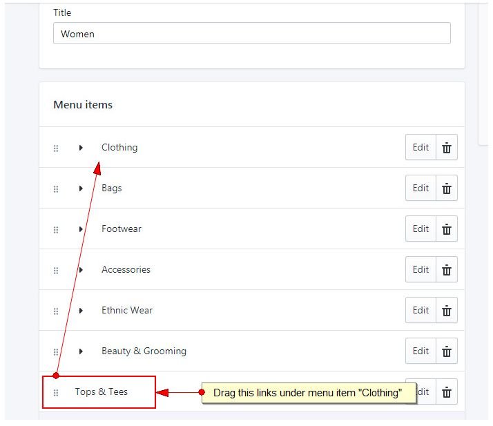 Now to add Menu links for Clothing, Add menu items in the same way and then drag that menu item under relavant menu item ( your choice )