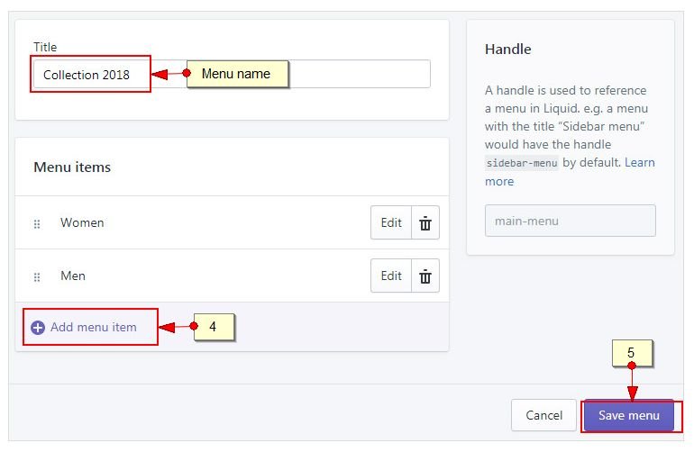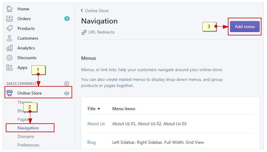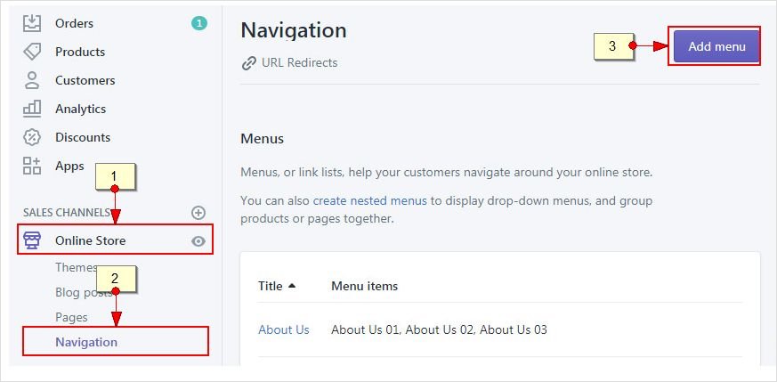 Go to Store Admin >> Online Store >> Navigation >> Add Menu