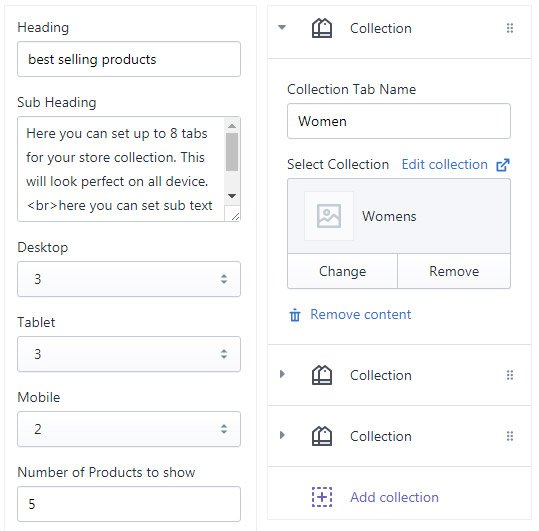 Go to Store Admin >> Online Stores >> Customize >> Sections >> Collection Tabs