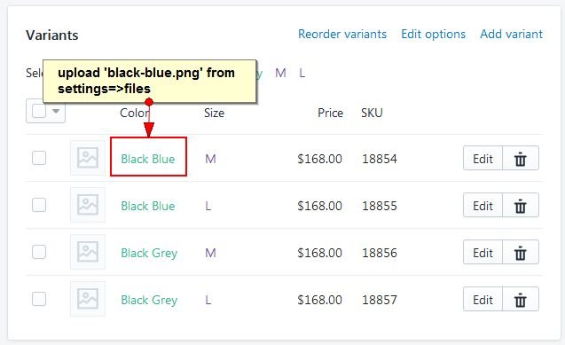 When you select Image Swatches style to display product swatches, Color name and image name must be same and upload image(png image) under Settings=>Files. For example you have 2 colors (Black and Blue )for your product, then upload image named 'black-blue.png'