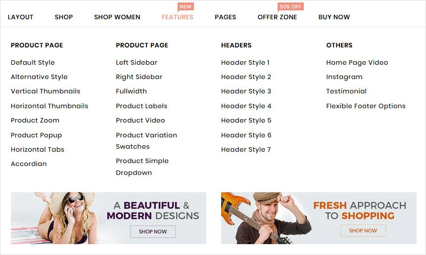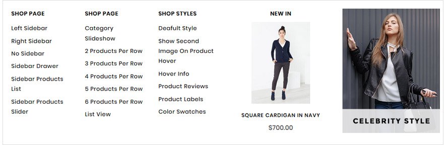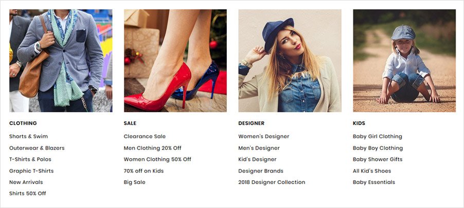 Here you can set 3 column, 4 column, up to 6 columns and 3 diffrent banner at the bottom of menu column You can display menu column with multiple rows