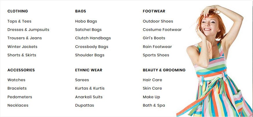 Megamenu Style 1 with 3 column menu (2 rows), Featured Product and Banner All options are flexible.