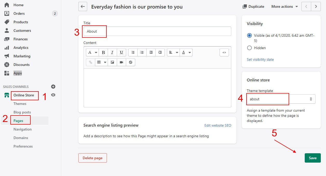 Online Store β> Pages β> Click Add page: Set page Title, choose Template about and click save button