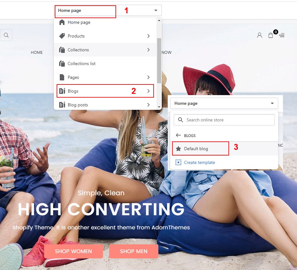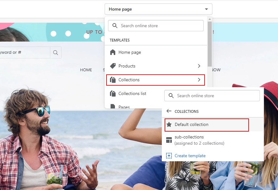 Go to Online Store β> Click Customize β> Open the drop-down menu at the top of the page β> Collections β> Default collection