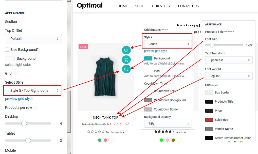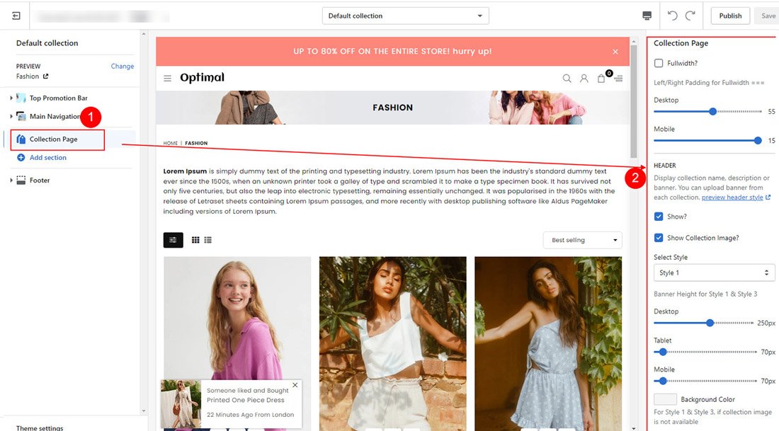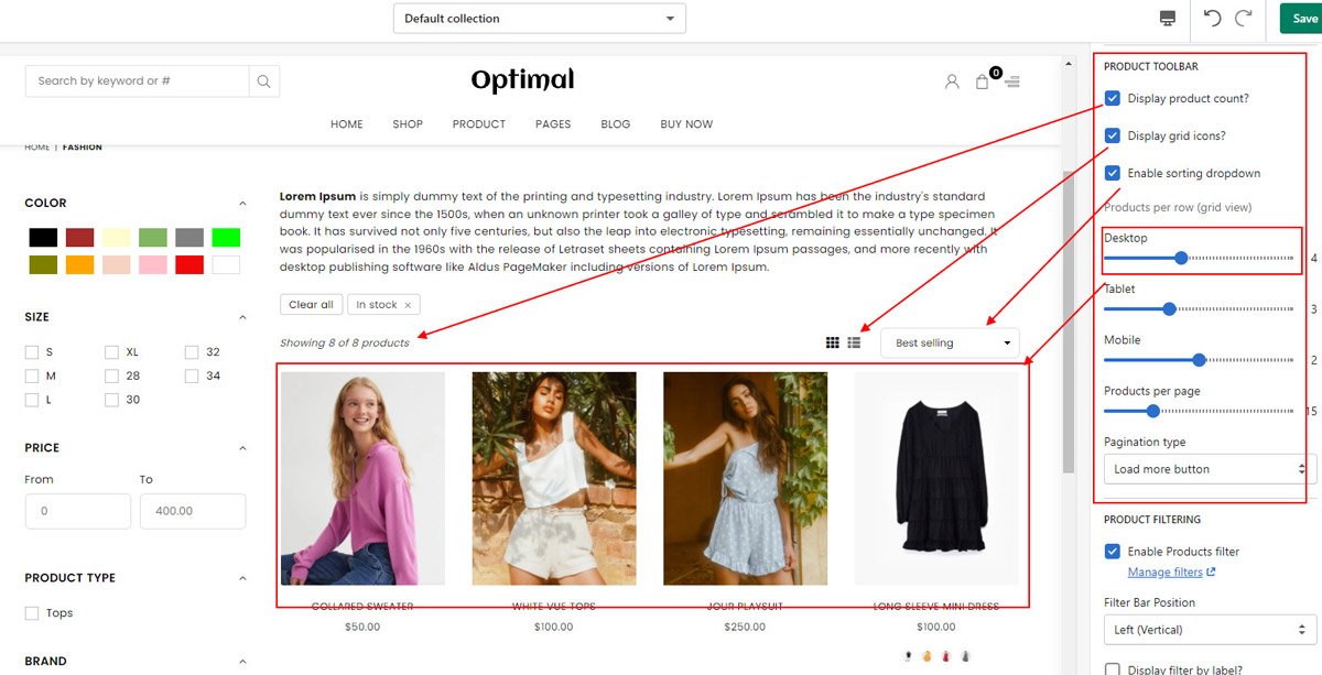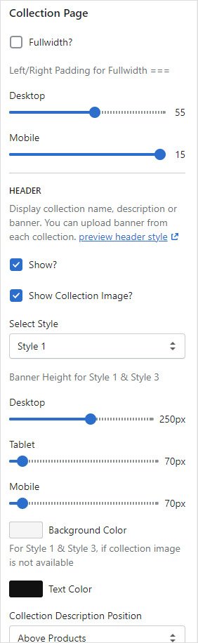 Click on Collection Page from left sidebar to customize page look and you will see all page options on right sidebar.