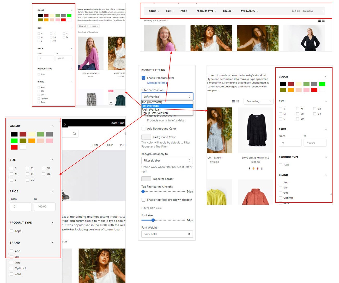 Online Store β> Customize β> Click "Sectons icon" from left bar β> Scroll down to bottom to the Custom colors section There are 4 style you can display products filter. Display in Left Sidebar, Right Sidebar, Top Bar, Popup Box