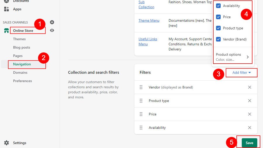 Click on Collection Page from left sidebar and you will see products filter options options on right sidebar.