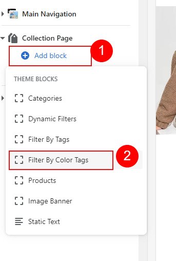 Click "Add block" from left sidebar and add Filter By Color Tags"