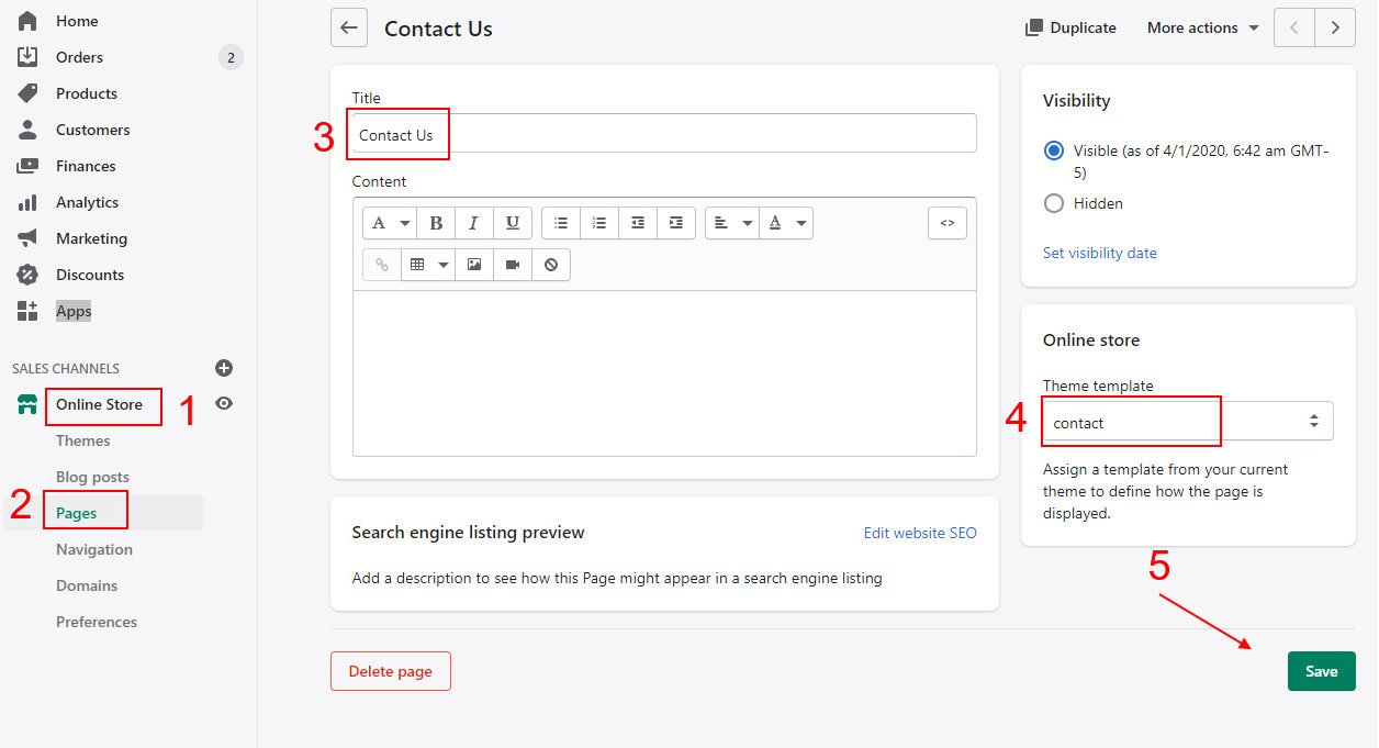 Online Store β> Pages β> Click Add page: Set page title, choose template contact or contact-2 and click save button