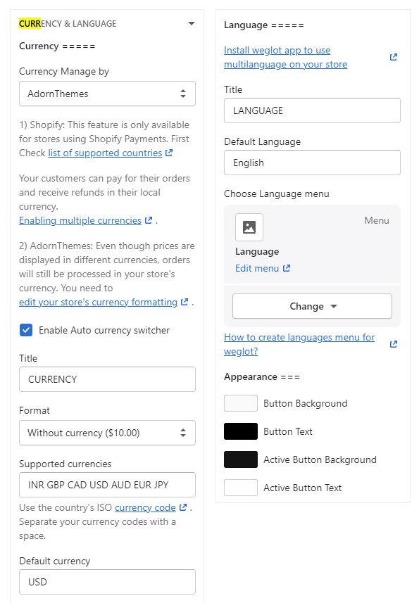 In Theme Settings, Click Currency & Language