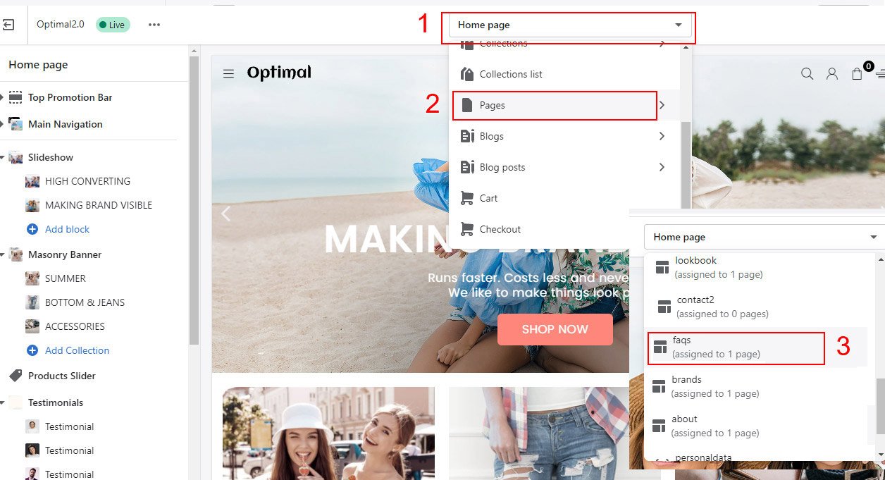 Online Store β> Click Customize β> Open the drop-down menu at the top of the page β> Pages β> faqs