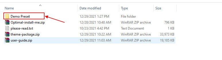 You will also find Demo Preset folder which contains preset/data files for other home skins/demos, User guide file and read me text file.