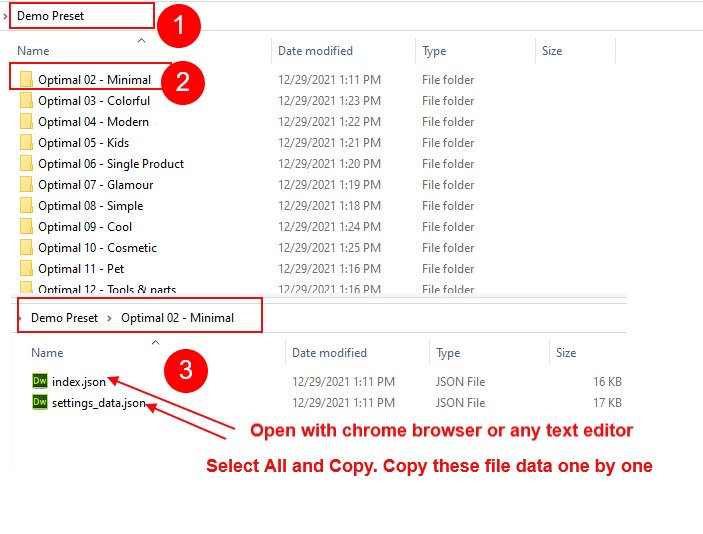 Extract/Unzip all files from downloaded package. Find "Optimal-install-me.zip" file. This is Home 1 Default Demo zip file. Install this zip file on your shopify store.