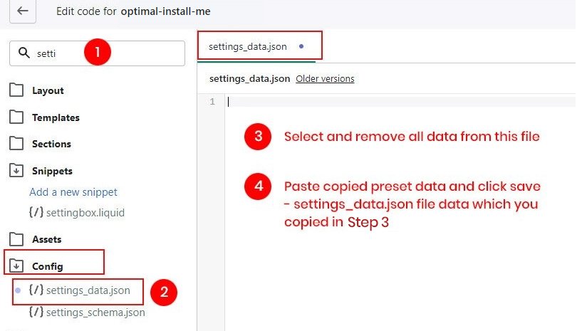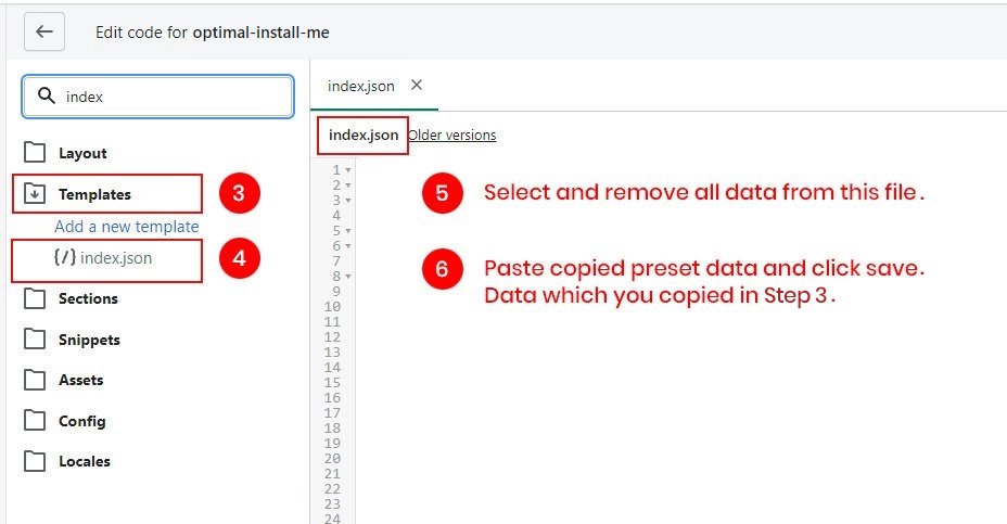 All you need to do is copy all data from index.json and settings_data.json file from any preset folder file and paste it on same theme file on your store. Explain in below steps..