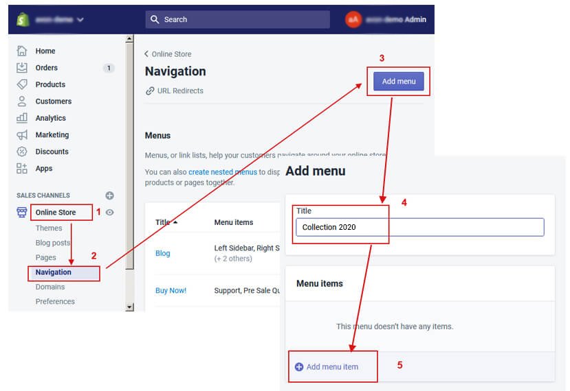 Online Store -> Navigation -> Add Menu with Sub Menu Items