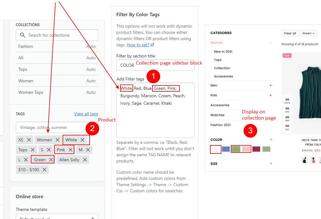 Online Store β> Customize β> Click "Sectons icon" from left bar β> Scroll down to bottom to the Custom colors section Now follow below steps to add Color filters