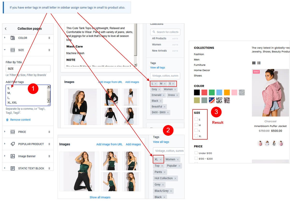Add Filter by section title and Filter tags. Select Swatch Size and Swatch Style from dropdown.