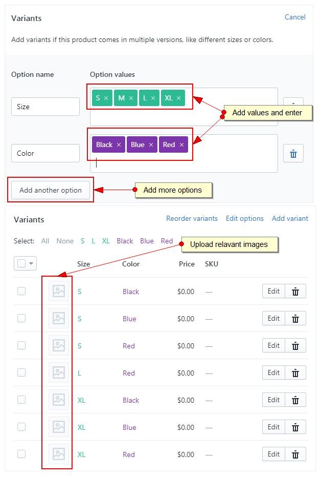 We advise reading and familiarizing yourself with the Shopify Variants. It is an extremely well written and easy to understand.