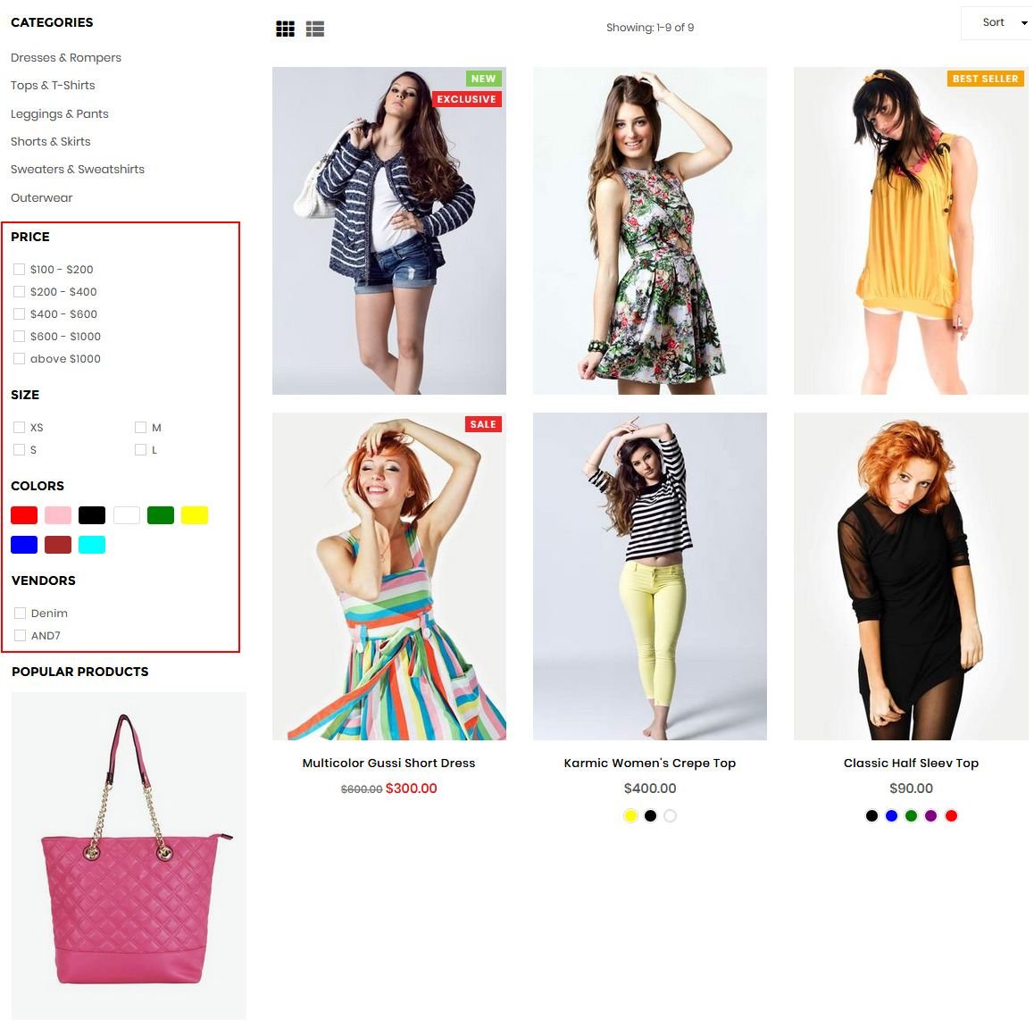 You can add unlimited filters, Populer products (Either you can use list or slider), Static text block and Promotion banner. Product filters worked on product tags. So carefully enter product tags at both side. ( Explained in detail at Use of Variants and Filtering section