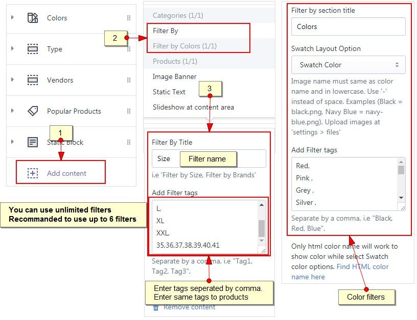 Scroll down to "SIDEBAR & FILTERS" and click on Add Content links at the bottom. Select Filter By option. Remember to add color filters select Filter By Colors option. Once you add blocks for Filter, Add title and tags into box separated by comma as shown below