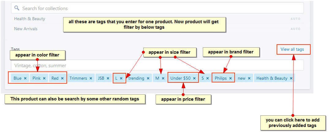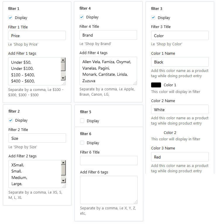 Enter tags(color, size or manuafacture)for product filter. Tags you enter here also need to assign to product to enable filtering ( Go to: Products > Products)