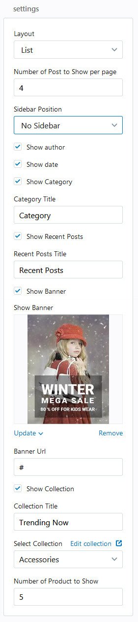 Go to: Online Stores >> Themes >> Customize theme >> Sections (Now click Blog from menu appearing on right side) >> Blog Pages