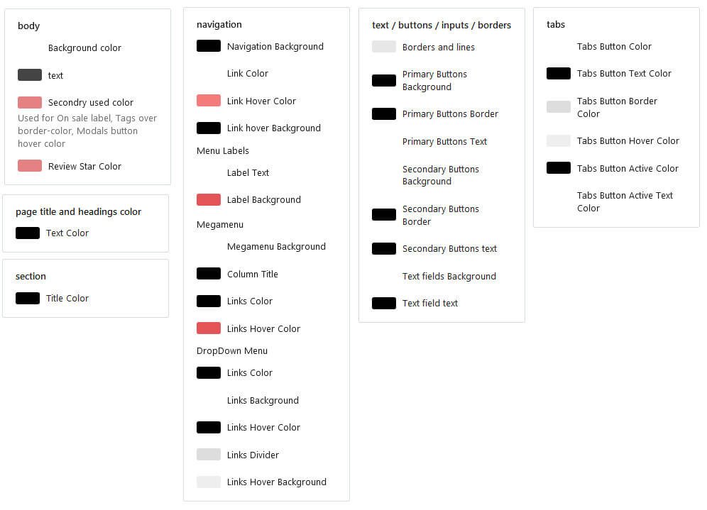 You have lots of options to config the Color of whole theme, Header, Footer, Page, Page Title, Section Title, Buttons, Price, Products tabs and many more...