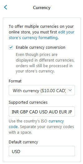 There are 2 options: Without Currency, Ex: $10 and With Currency, $10 CAD