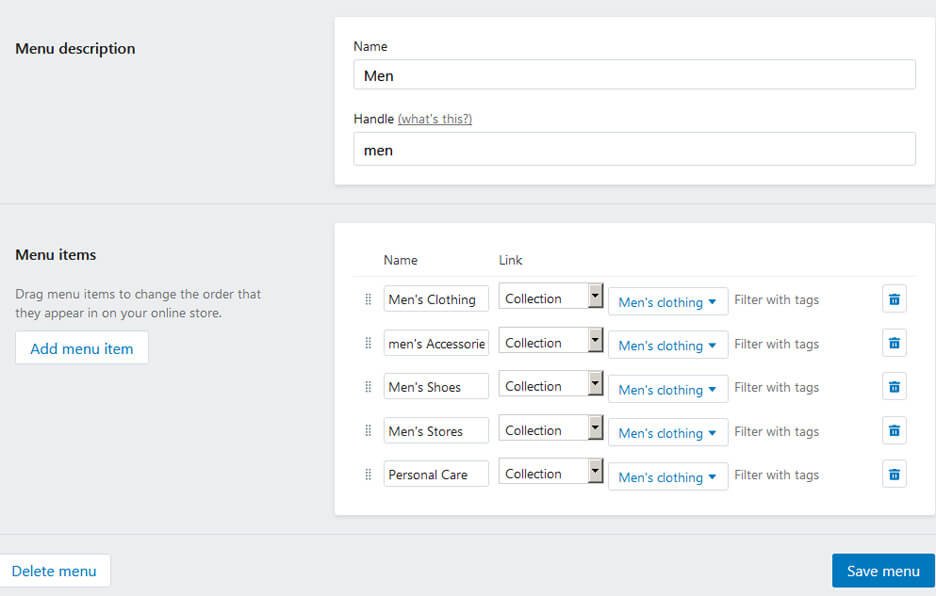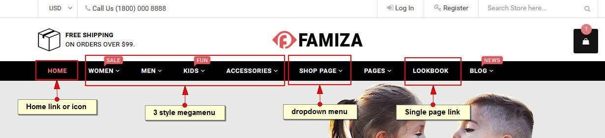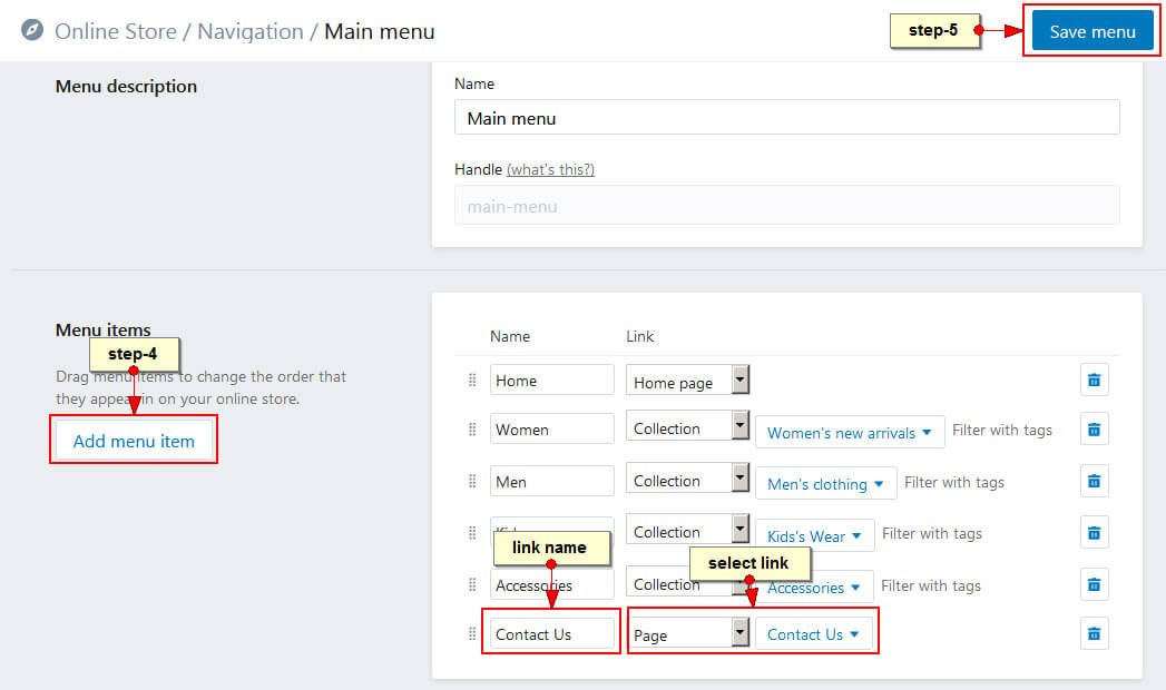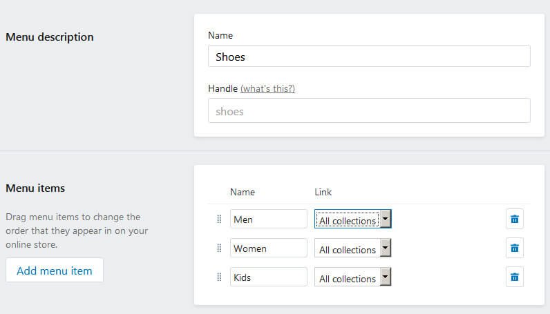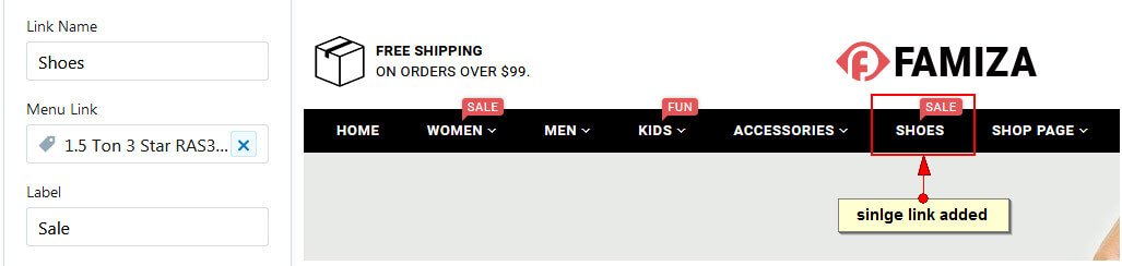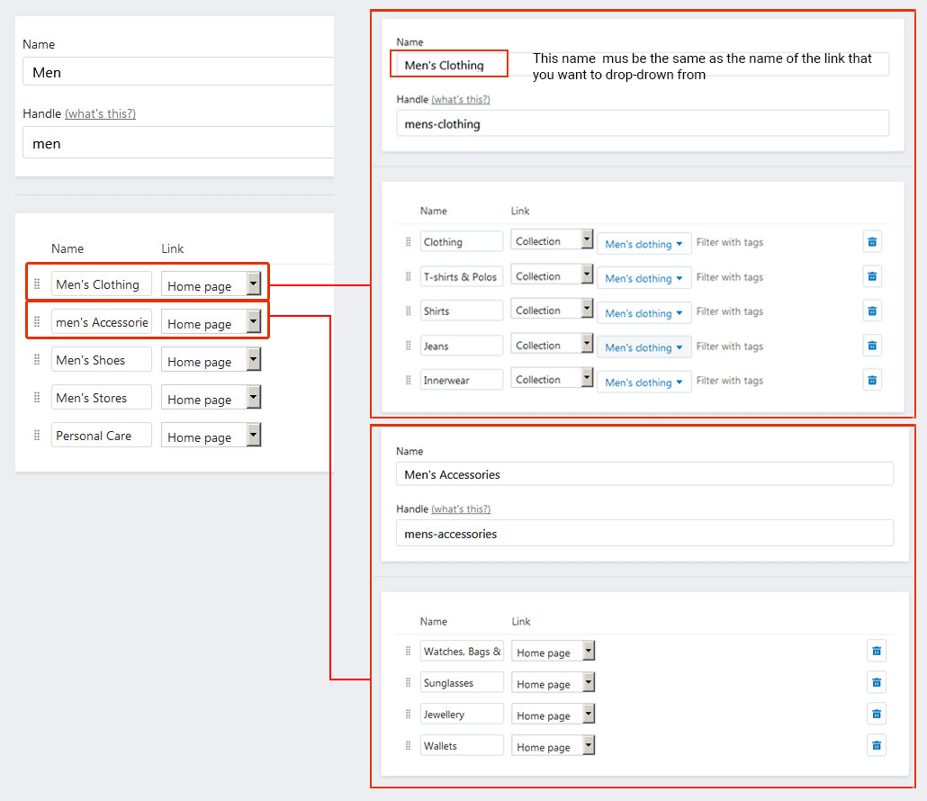 Note:The name you add for dropdown MUST be the same as the name of the link that you want to drop-down from. If you want to create the drop-down For Shoes, so the name will be Shoes for drodown. See below