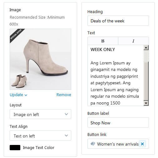 Go to: Online Stores >> Themes >> Customize theme >> Sections >> Deals of the week (Image with text)
