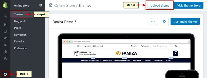 Extract all zip files from downloaded package "famiza-package". Now log in to your Shopify store and go to the Online Store. Now click on Upload Theme and upload the famiza-demo-vX.zip file (vx i.e diffrent demo number) included with this package. Diffrent demo packages included in this package. i.e Famiza-demo-1, Famiza demo-2... You can select any demo