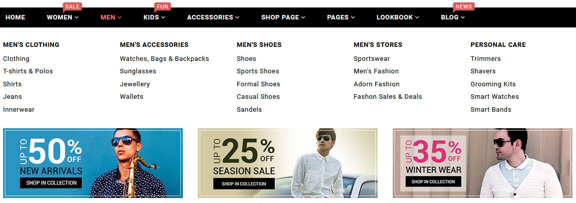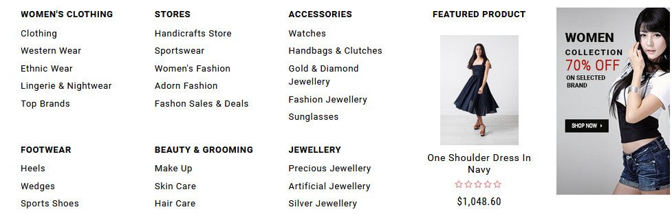 Now to add links for Men's Clothing, You must create dropdown with name "Men's Clothing". Follow the same for other menu items . See below navigation hierarchy