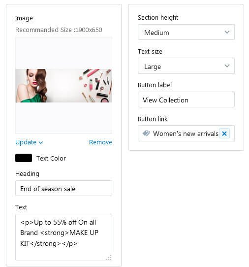 Go to: Online Stores >> Themes >> Customize theme >> Sections >> End of season sale (Image with text overlay)