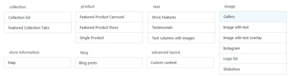 Go to: Online Stores >> Themes >> Customize theme >> Sections >> Gallery