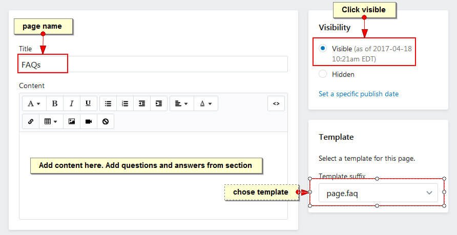 Go to: Online Stores >> Themes >> Customize theme >> Sections (Now click FAQs from menu appearing on right side) >> FAQ Page