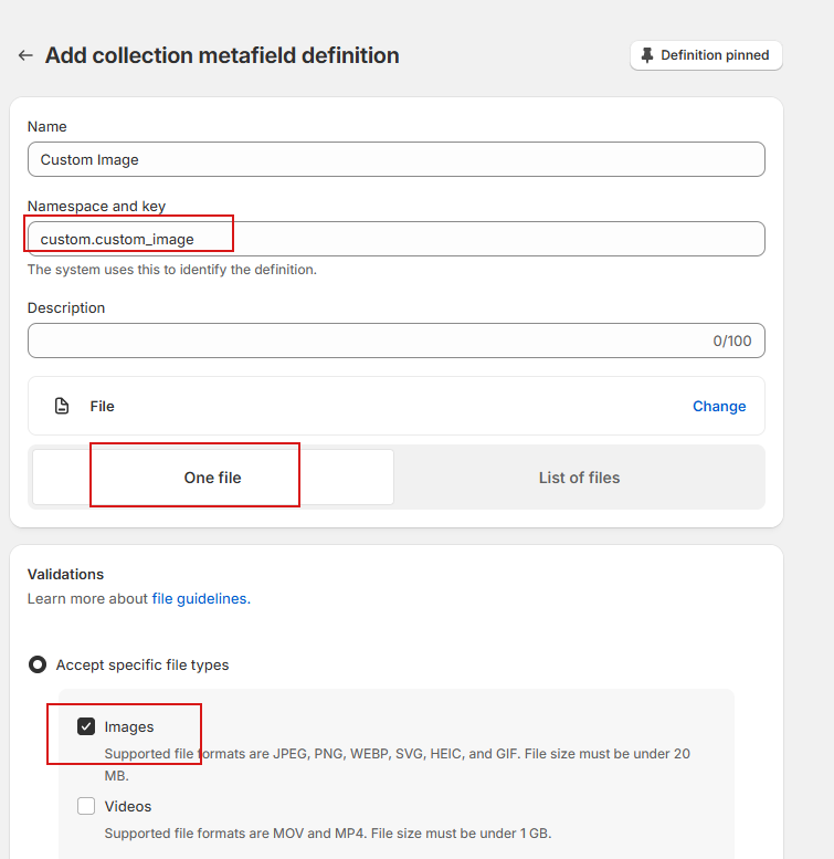 To showcase a custom image for collections, please create a metafield following the steps outlined below.