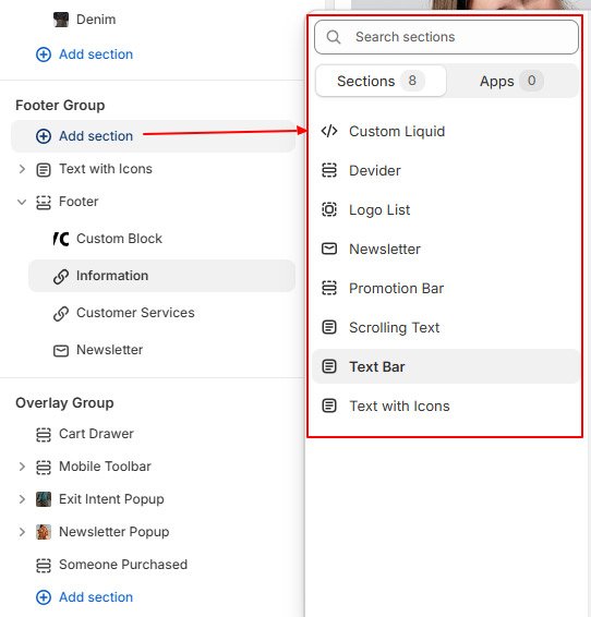 The sections within the Footer group can be accessed from every page. Footer group’s sections appears at bottom of the store.