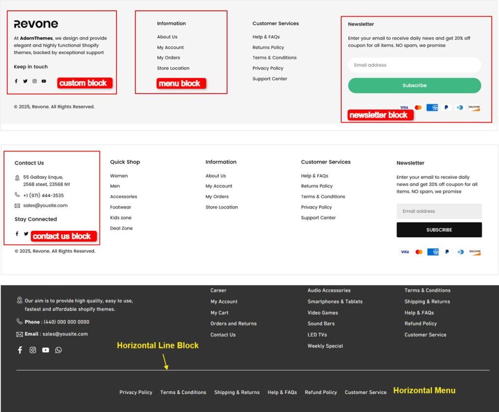 There are total eight available blocks to build footer for your online store. Preview different footer style on live demos