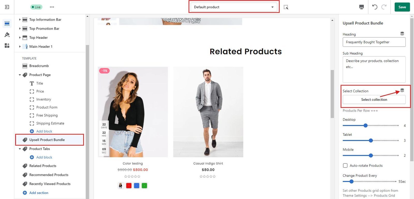 Now, on the product page, open the “Upsell Product Bundle” section in theme customize and add the metafield collection to the “Select Collection” field as shown below.