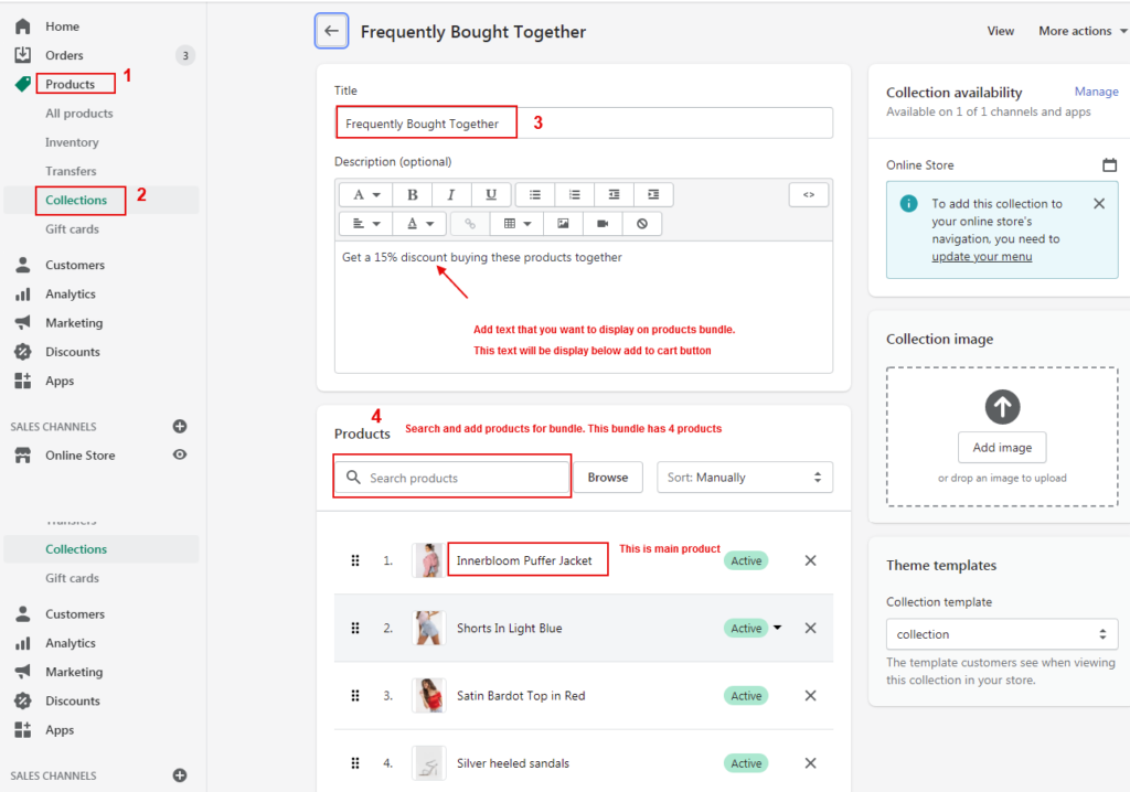 To offer bundled products and discounts, first you need to create a collection of all the products you want to offer bundled and discounted. ( You can add products that buyers should buy together.)