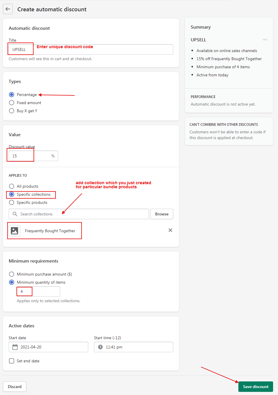 Now Go to Discounts section in store admin to create a discount code that you want to offer for product bundles (a collection that you just created).