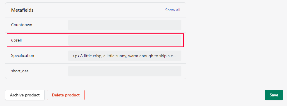 Now go to your product and scroll down to “Metafields” and select the collection created in step 3 and save the page.