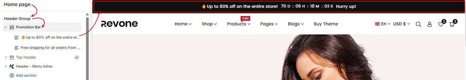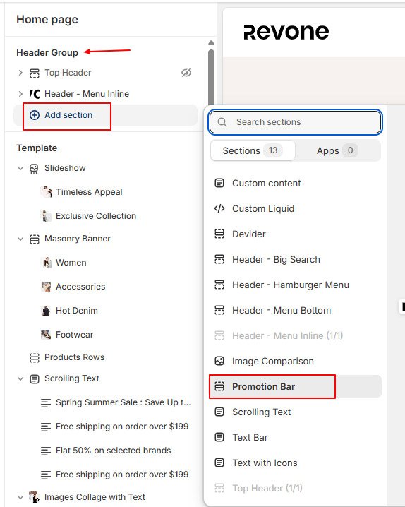 - In the theme editor, Home Page -> Header Group -> Click on Add section -> Promotion Bar