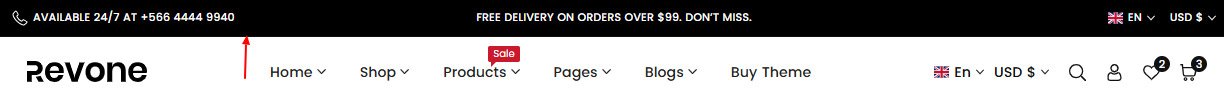 The top header is positioned on the main header. It display essential information such as links, phone number, promotional text, social media icons, and options for language and currency selection.
